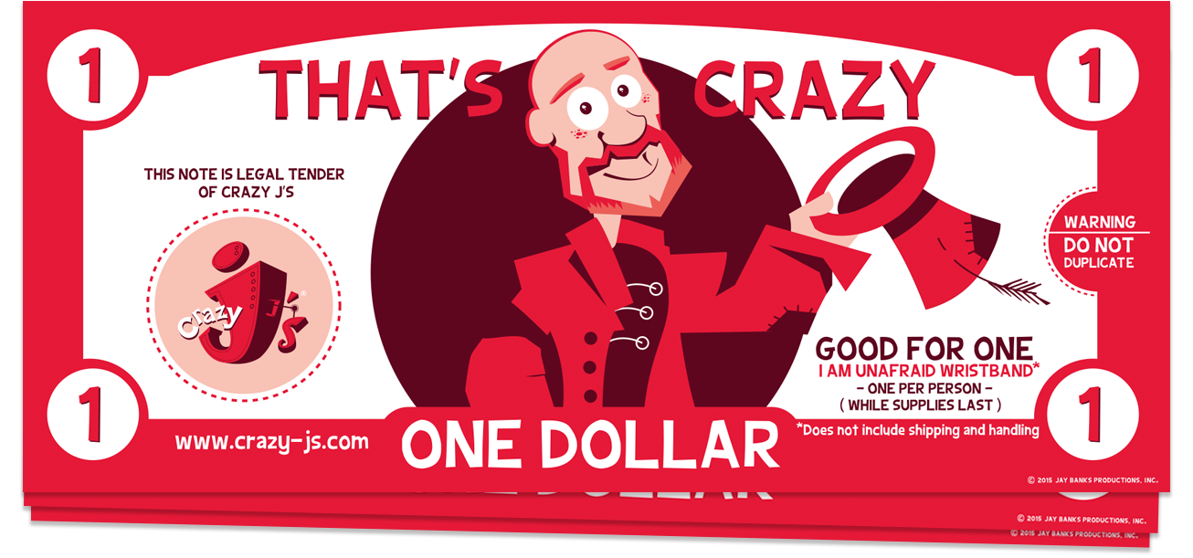 Crazy Cash comes with tagged purchases at the Crazy J’s Store! Be sure your item is marked with Crazy Cash before your purshase. *Sometimes they’re good towards free items; sometimes they’re credit towards the purchase of other products. For instance, in the first edition of the I AM UNAFRAID book, Crazy Cash was included on the CD good for a free UNAFRAID blue or yellow wristband (shipping and handling extra). As more products are added, more Crazy Cash will be available.